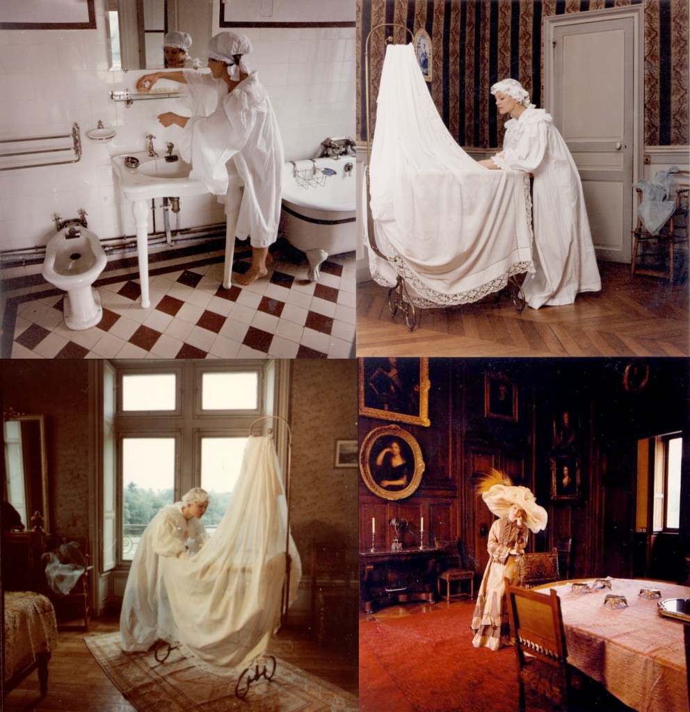 I was posing inside the bedroom, in the bathroom, next to the cradle, in the dining salon, at the large staircase or the castle, as well as, in front of it, in the park, dressed in day and night garments of Cont Saint-Pierres’ aunt, while, as well, at one of the photos, dressed as a gentleman with a tiny mustache and a discrete sideburns in front of the stables. With this project, I was traversting from my socialist, working class Yugoslav background into the identity of French aristocracy, dealing with my own identity, playing with my host’s family tradition, class and gender roles, and the ‘dreams that every little girl has’.