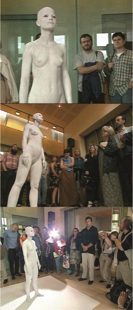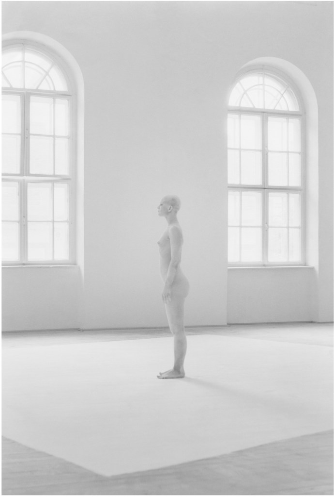 «In this performance Tanja Ostojić has critically evoked spiritual visions of the body from the medieval spiritual tradition and combined two aspects: nuditas naturalis and nuditas virtualis. Her body, purified of bodily hair, covered by marble powder, has been transformed (being a tableau vivant) into an image as folding of the outside into the inside. The question is how such a static act (Tanja Ostojić does not move her body throughout the whole performance) manages actually to «perform». The body communicates through movements, and the lack of these body techniques suggests an agonising position that is monumentalised. This performance, being a tableau vivant, is not «only» a living sculpture (in the manner of 1970s art) but rather a living monument carrying in itself all the pomp and the historical symbolic weight associated with such gestures of grandeur. In a position where the beholder fixes his/her gaze on a body vulnerably exposed, s/he witnesses not only a mute statement of the indisposition of an artist to act within a hostile environment (for someone living in Serbia this carries the double weight of an internal/local and external/international isolation of a subject-in-opposition) but also discloses the wider image of woman’s body in art history as a sad affair of symbolisation and manipulation.»