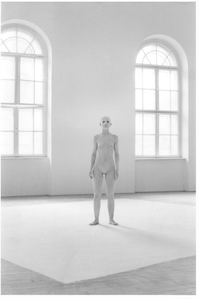 Personal Space is a static performance incorporating original sound and video material. Performed on the occasion of Manifesta 2, European Biennial of Contemporary Art, inside the Elevator of the Musee d’Histoire de la Ville de Luxembourg (City Museum), June 26/27/28, 1998, for one hour on each day. Inside the spacious elevator, I had placed a square of non-affixed white marble powder in which I stood, with my head and body shaved and covered in marble dust. The audience was able to use the elevator as usual (pressing the buttons on the control board, entering and exiting at the desired level), or to remain in it for as long as they wished, given my performance. Thus, the audience could see me only in a static position in the chosen space. After the performance ended, the elevator went back into regular use, carrying the sound that marked the space, the sound that describes silence, composed specially for this work by Vladimir Radonjić This gentle, anxious sound-landscape was able to reflect my perturbed soul. The viewing of the performance Personal Space was possible for the duration of Manifesta 2 with the use of existing museum equipment for transmission of documentary video: liquid crystal display monitors on each floor of the museum, next to the elevator.