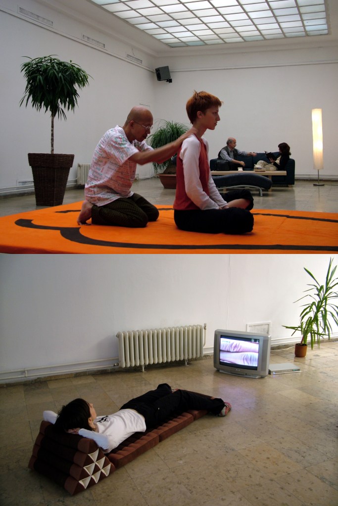 Visitors who made their appointments for either the Massage salon or the Tea salon waited for their turn in the pleasantly furnished waiting room. They had at their disposal art magazines, books, catalogues and hand-made traditional Thai medical preparations. Then the visitors underwent the traditional Thai massage performed by Suwan Laimanee (the body healer) or, had the opportunity of meeting Tanja Ostojić (the soul healer) in the pleasant atmosphere of the Tea salon, where they could talk about their private lives, contemporary art or other topics over a cup of green tea. Prises were popular, with reduction for unemployed, students and pensionists. The Salon was open for twelve days, and the artists were at the visitors’ disposal for eight hours a day, often even longer than that.