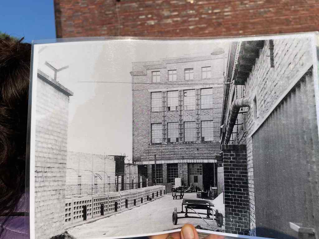 This was the only building that was not blown up on the Mauerweg, instead, at the time of Berlin Wall, it was fortified, barricaded and used as a factory for repair of East Berlin’s public transportation busses. All windows of the western facade were blinded out by bricks and metal panels, to prevent employees finding the escape route. After the wall, some of the windows have been gradually freed while apparently bricks ended up in the flood trench.