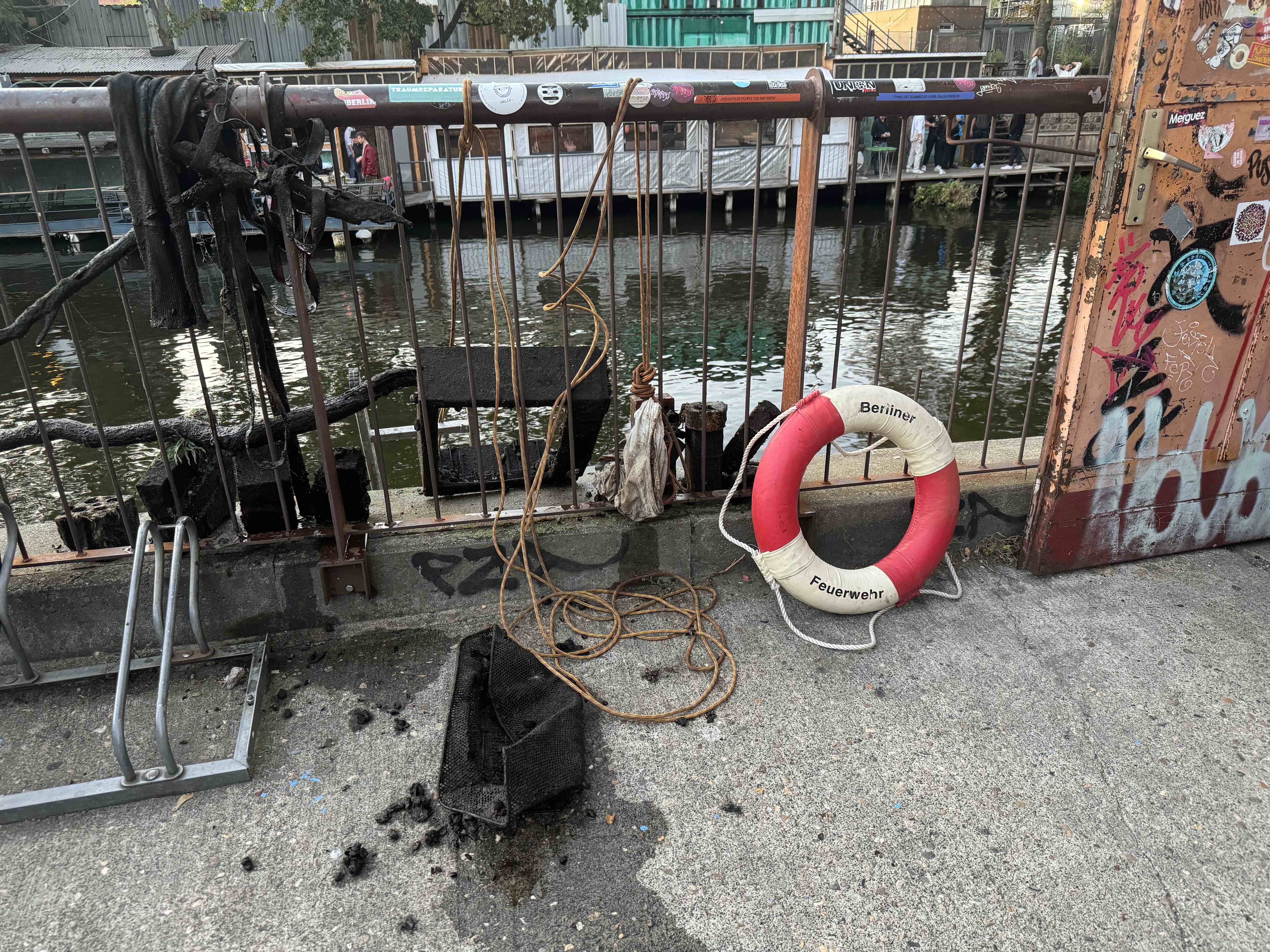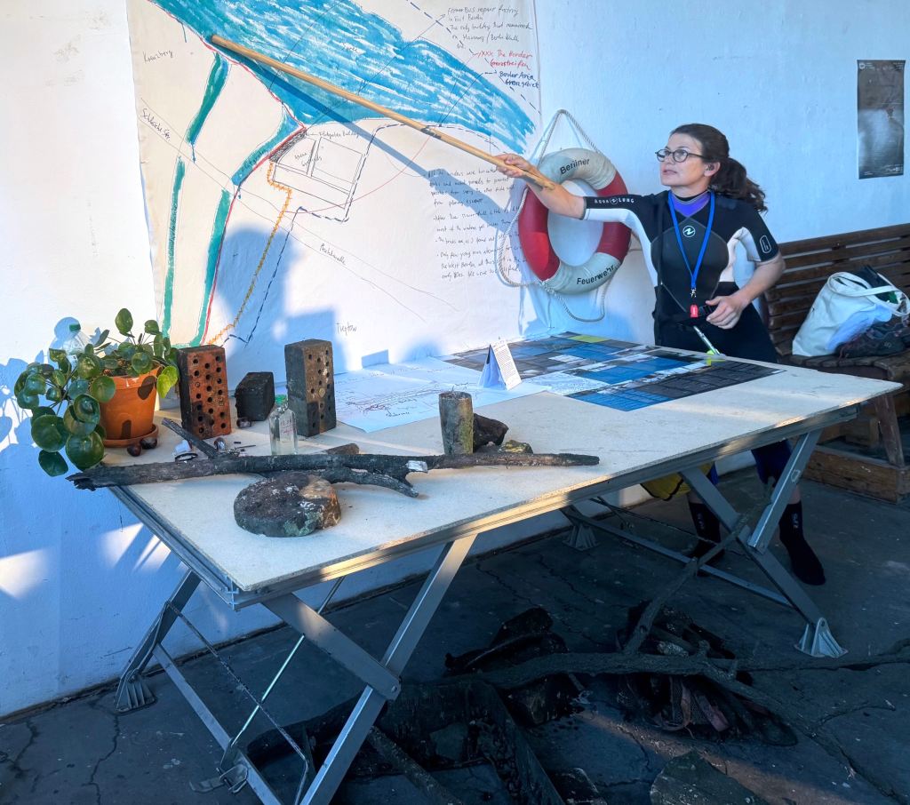 The work poetically highlighted the Flutgraben e.V building’s river-like shape, commemorating its position on what once was a peace of nature, as the building was in part constructed inside the river, while the walls and materials at the bottom of the canal witness shadows of the past, due to its location on the historical borders of the Berlin-Wall.