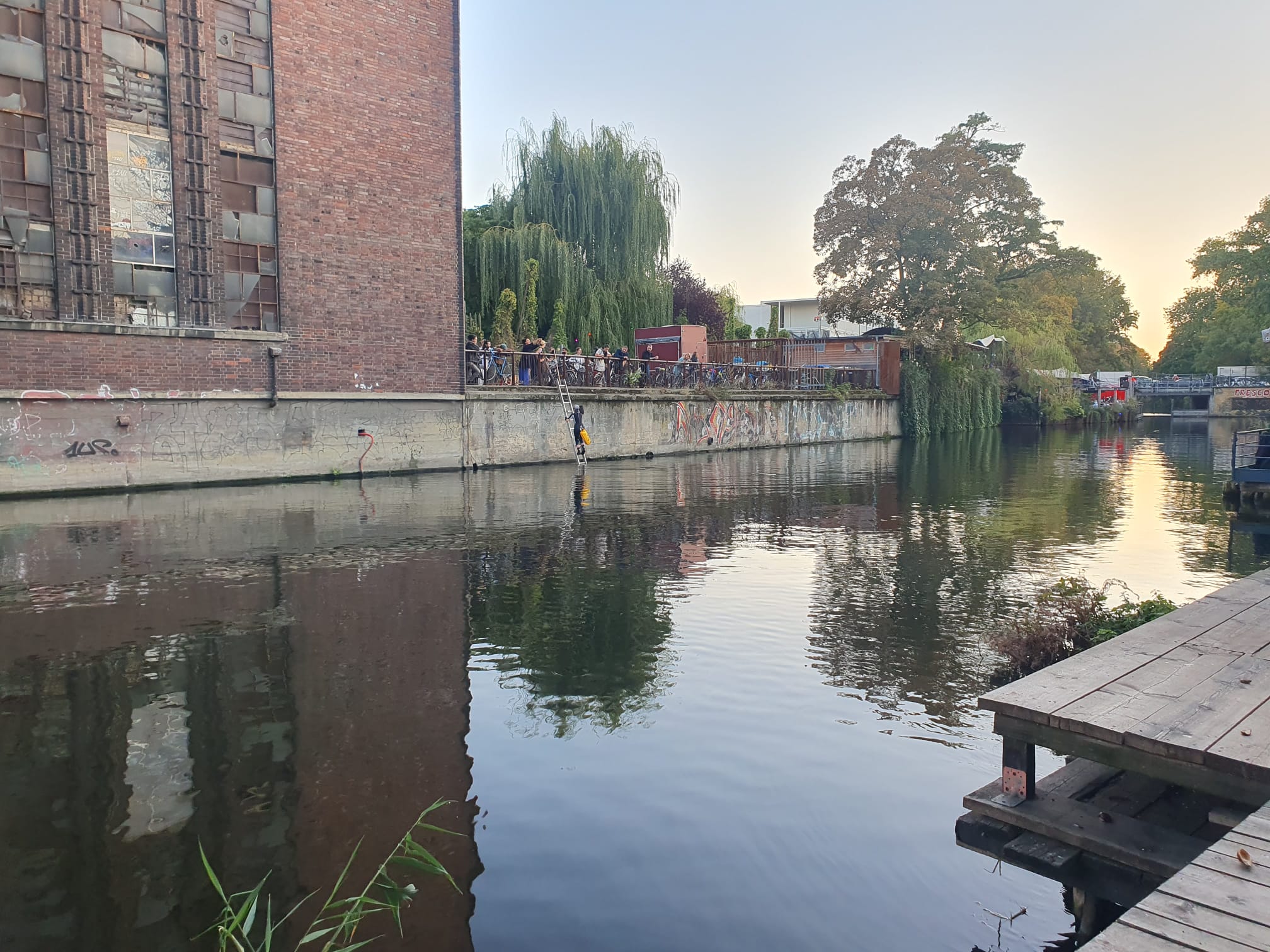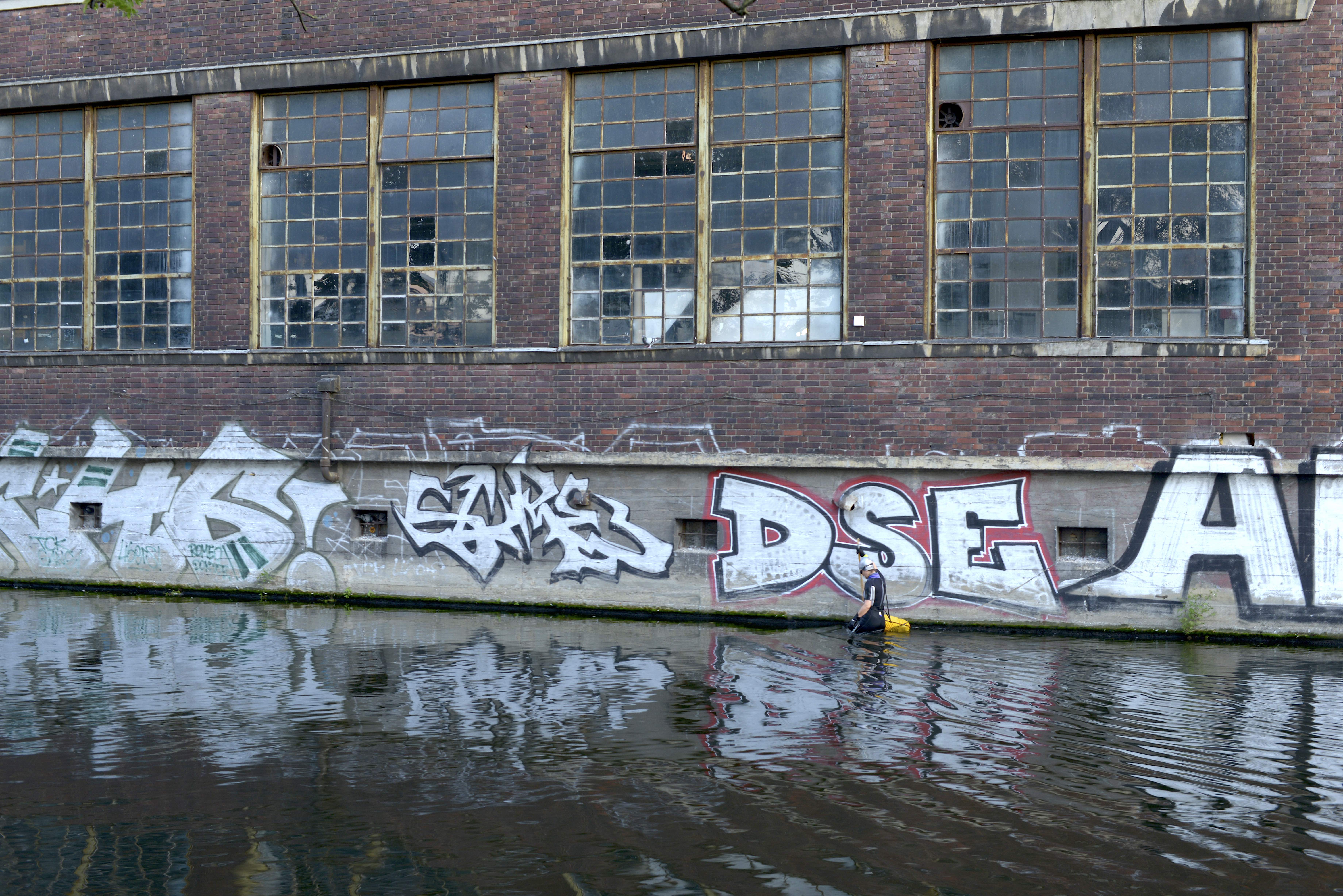 While elaborating on bodily contact with the facade, the surrounding water, and layers of history, I found out that some of the windows are still covered by bricks, and that many bricks are still to be found in the water.
