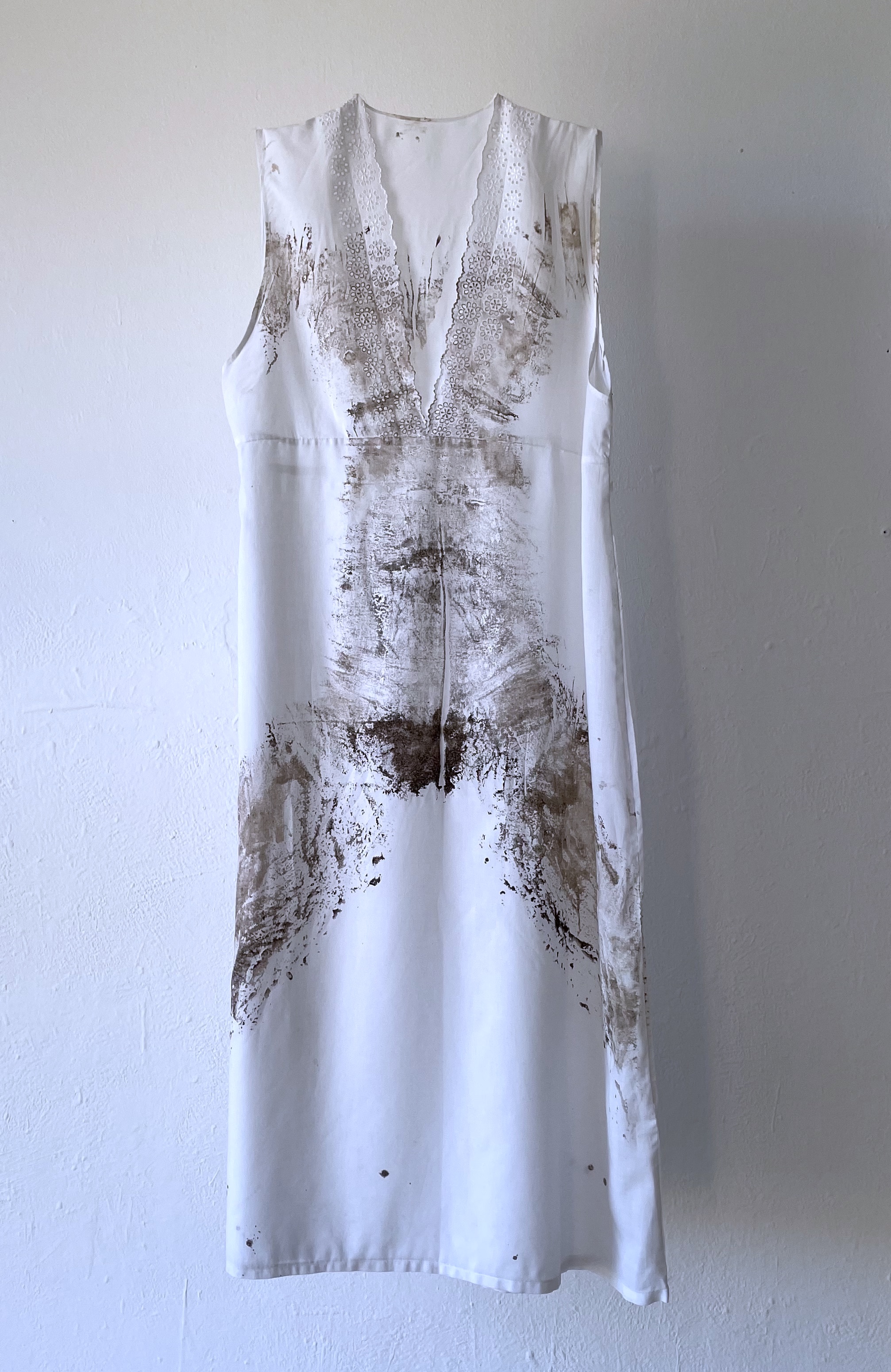 Traces is a series of processes, drawings, prints, and photos on paper, textile and objects, using healing mud, mud bath and own body, since January 6, 2024.